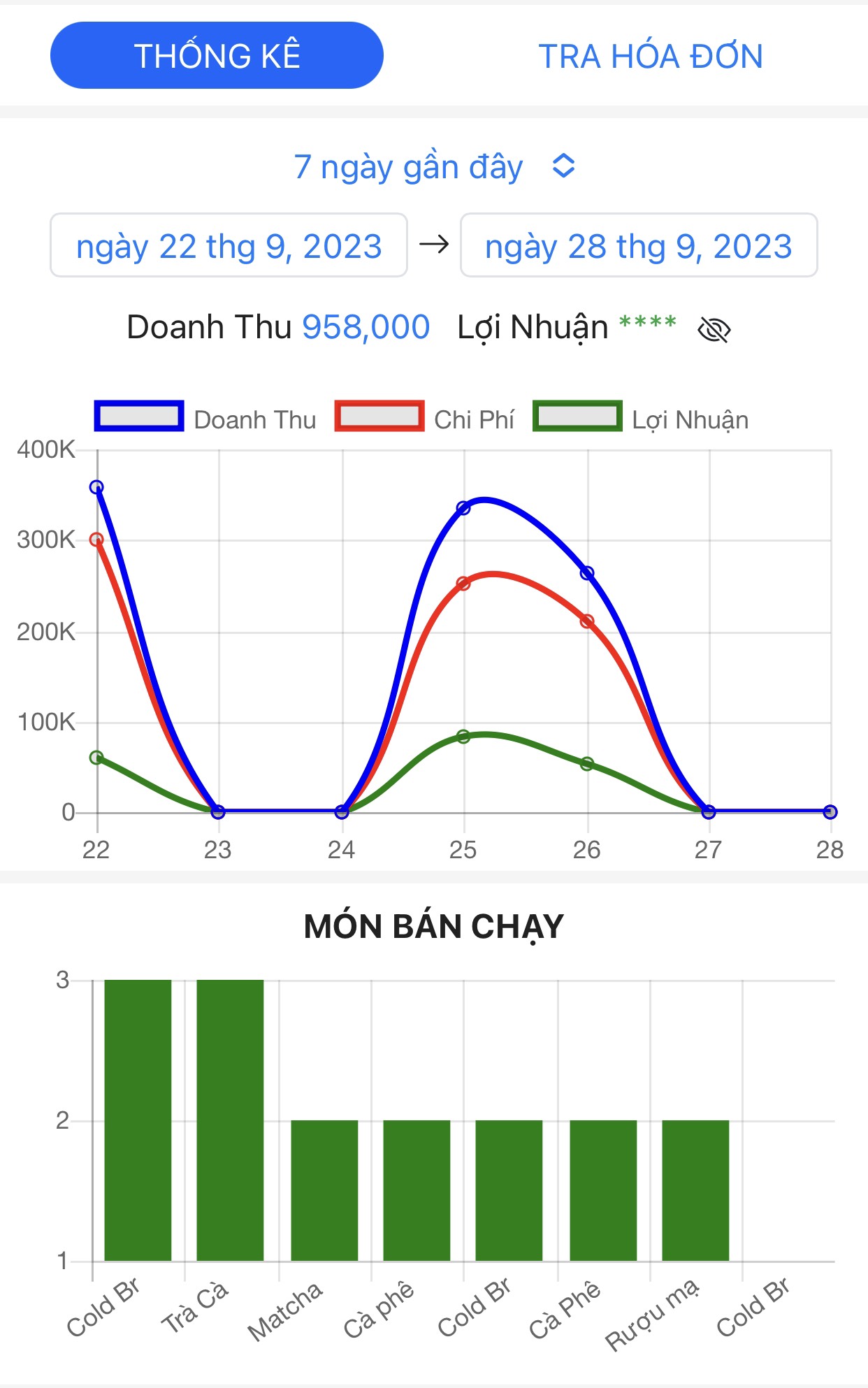 + Thống kê doanh thu, lợi nhuận theo từng giai đoạn.+ Thống kê danh sách món bán chạy và doanh số từng món để có thể điều chỉnh kịp thời.